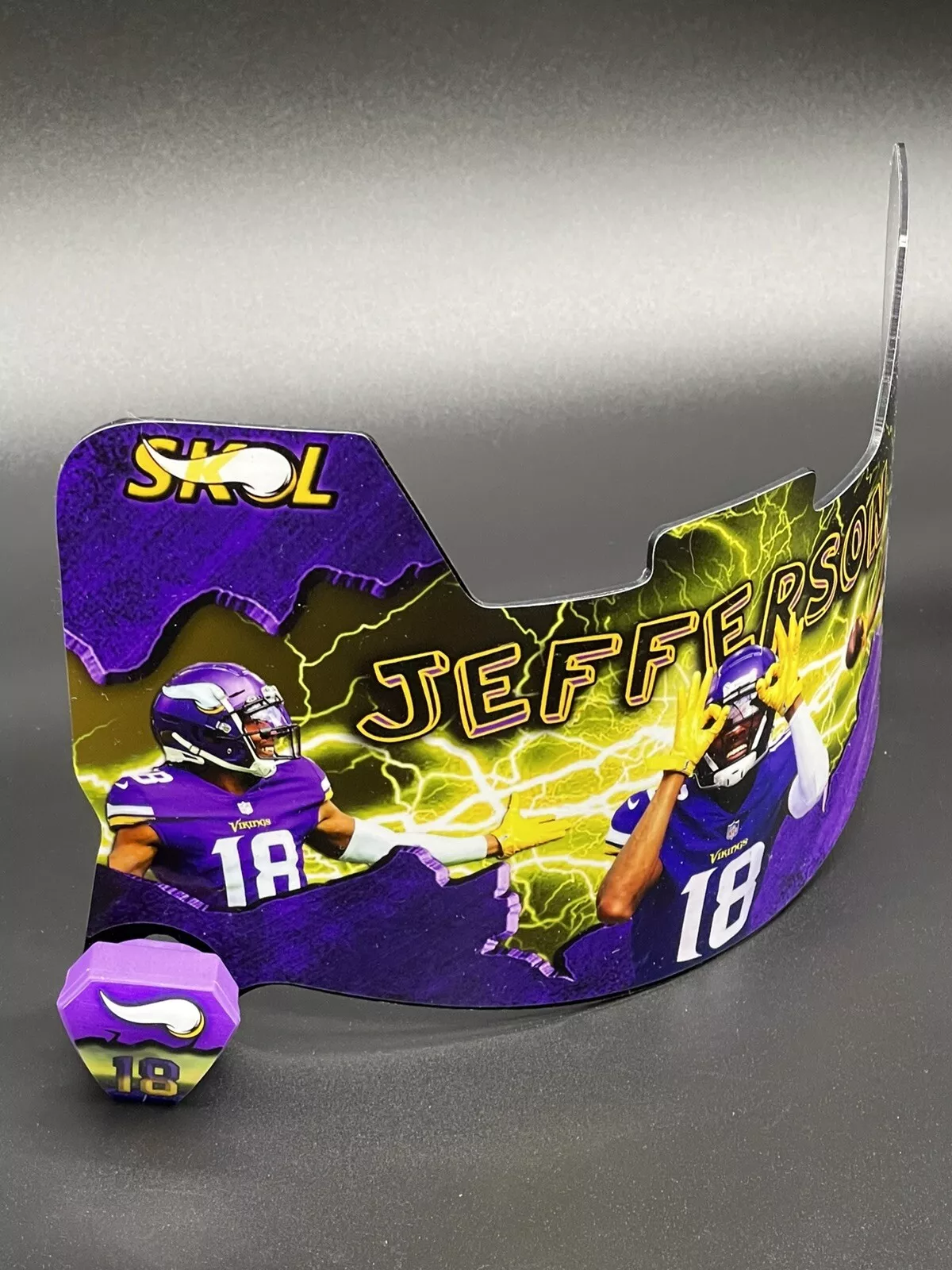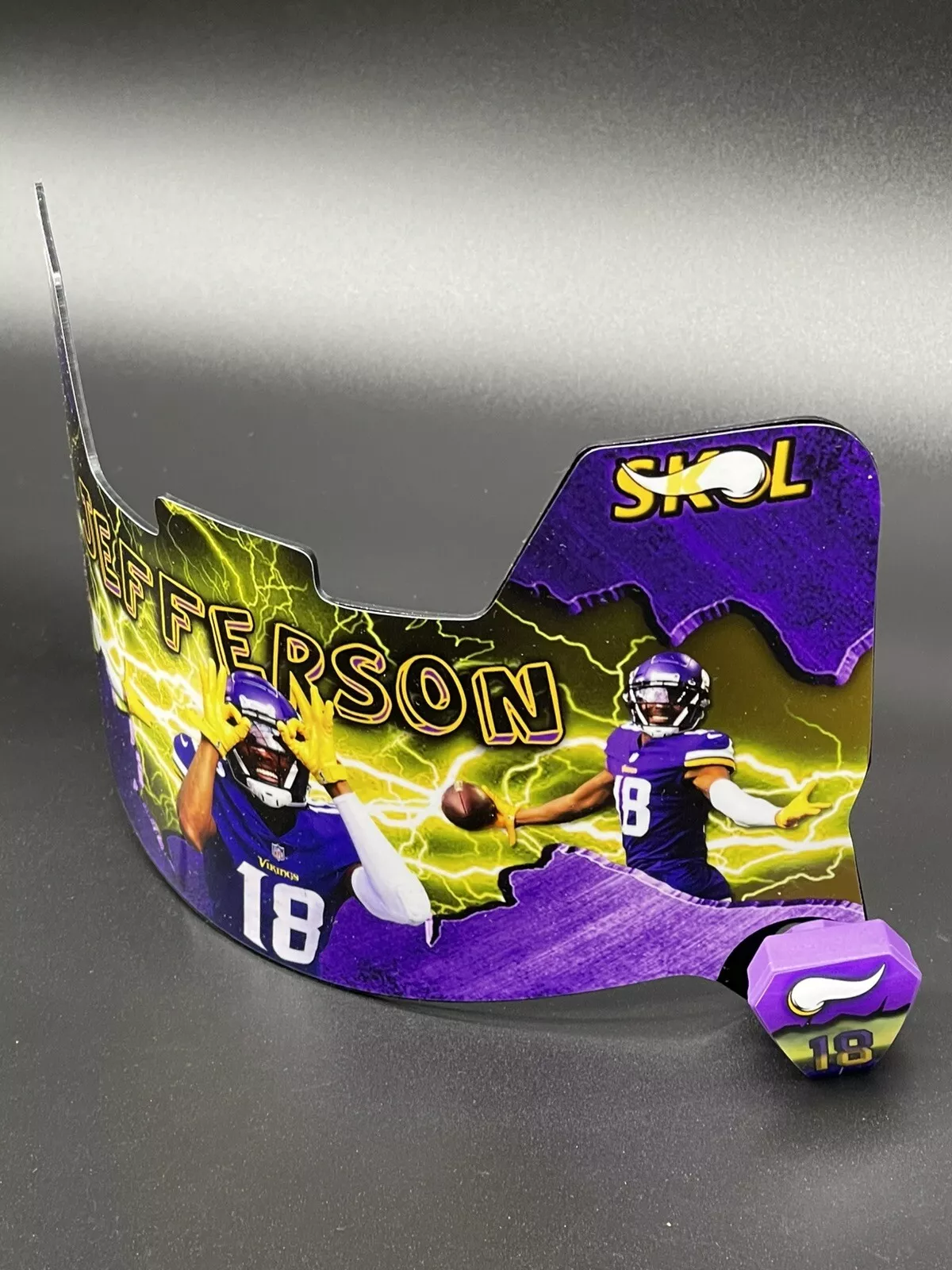 Show off your love Minnesota Vikings star Wide Receiver Justin Jefferson with this full size custom visor. This visor fits all full-size NFL helmet and as a must have for any collector.